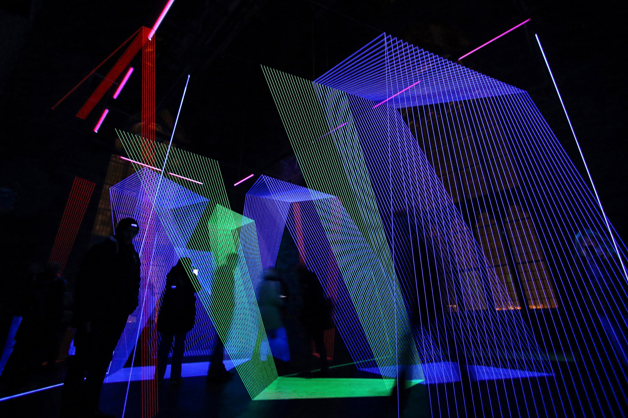 JC// There are two types of thread and light installations that I create. In the first case, the installation is realized in a black box (painted black). Here the lines look much more like a beam of light (laser). And the black environment leads to visitors not feeling the boundaries of the space and experiencing a confusing perception of the space.