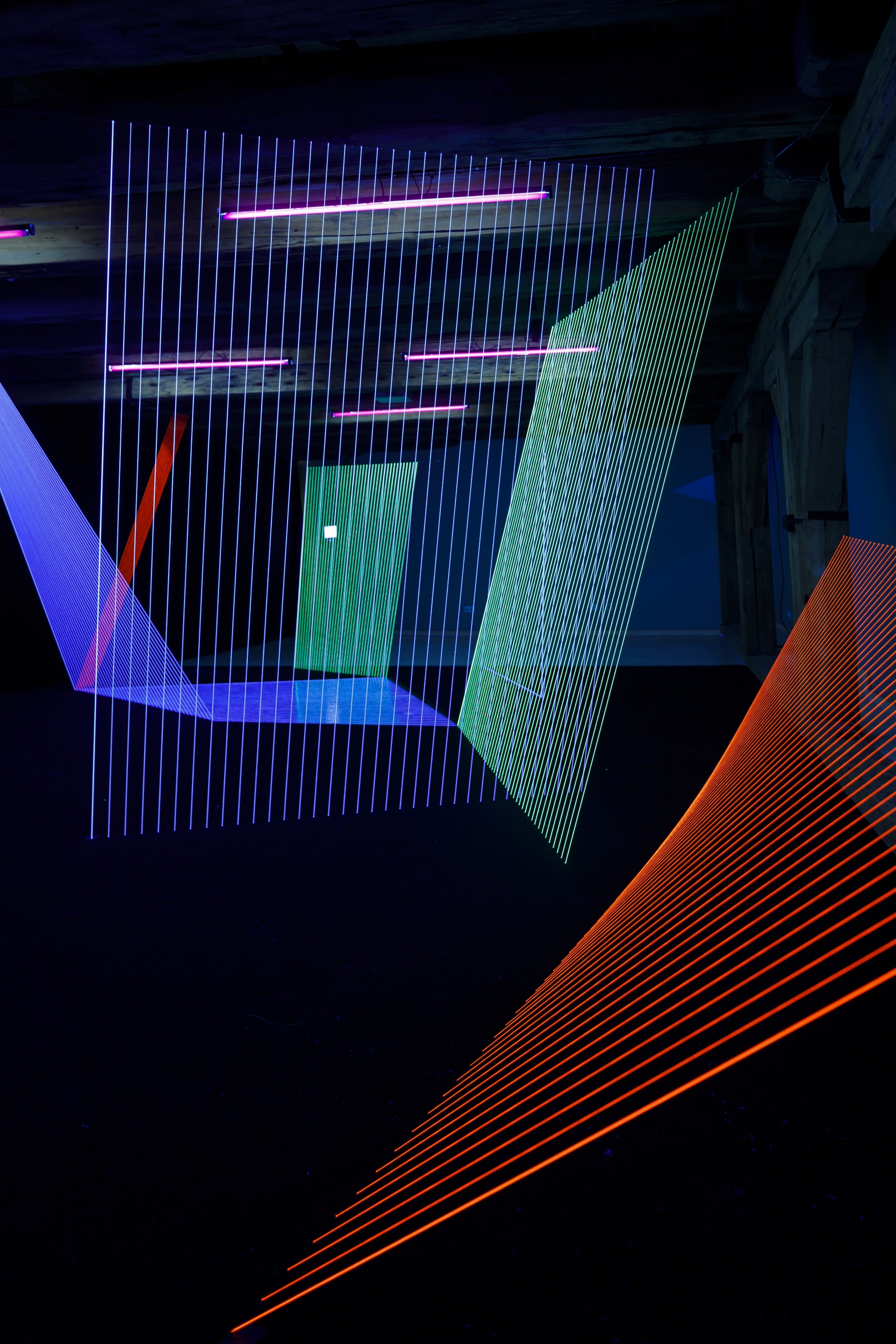 YC// The thread lines are also somewhat visible in daylight. The color intensity will increase under UV light. There is a good example of me working with daylight and UV light at the same time. In my solo exhibition at the FRAC Alsace in France, I took “nature” as a concept and did not darken the three-sided glass façade, but showed the color changes of the installation over time. In daylight and at dusk and at evening with UV light only. Visitors sometimes came by several times or at dusk so that they could see the gradual changes in the installation.
