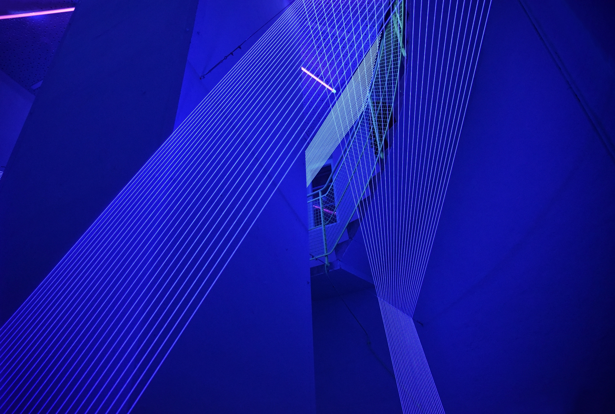 YC// I have been working with UV light since 2006. When I started making spatial drawings with threads, it was important for me to imagine the space as paper or canvas. In daylight, my drawings have to compete with the surrounding space for the viewer’s attention and in some rooms they don’t come into their own at all. Then I had an idea: I could darken the room, but this would also make my thread drawings invisible. The solution was black light, with which I can illuminate selectively: The lines stand out, the surrounding space recedes. The UV light makes it possible to empty the space a little in order to emphasize the drawing and make visible things invisible and invisible things visible. The UV light causes the space as a three-dimensional work surface surrounding the installation to dissolve its original characteristics in order to create a new space that is inseparable from the installation.