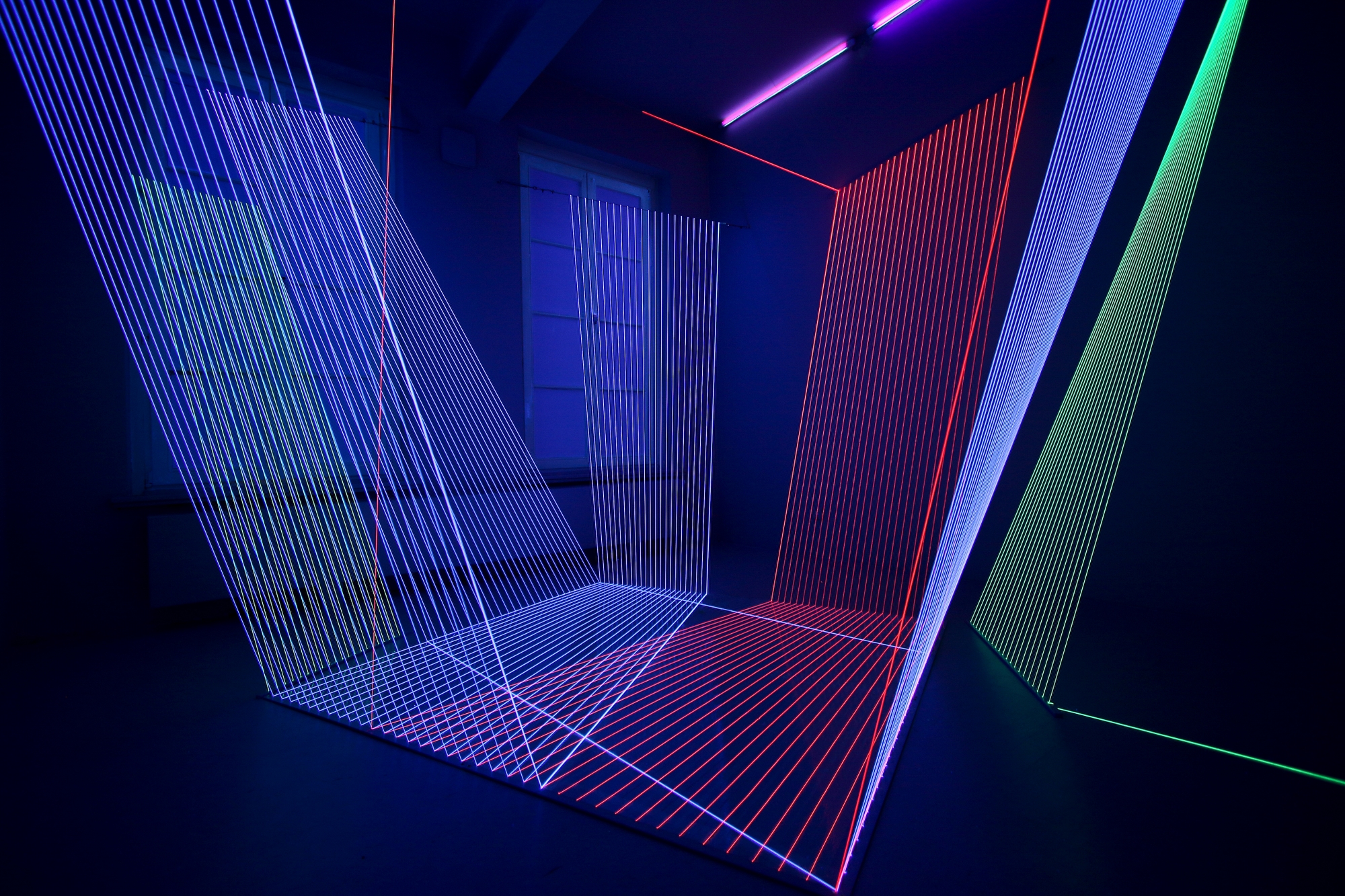 Jeongmoon Choi’s artworks are drawings in space. Her pictorial material is elastic thread with a fluorescent coating, glowing in the dark when exposed to UV light. She develops geometric compositions conditioned by the space they inhabit. The origins and ends of her thread formations disappear into the darkness, her compositions seem to float in space.