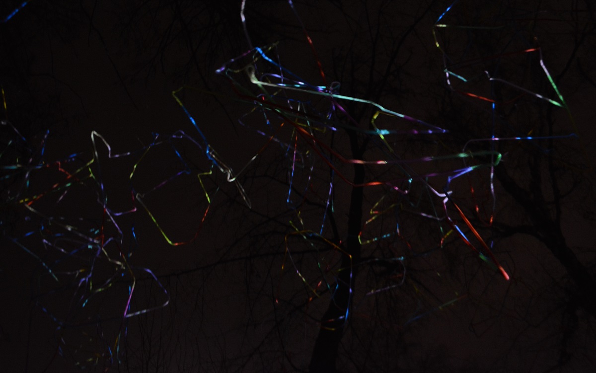 Strings of LEDs were the material for the kinetic installation “Second Nature” by the artists’ collective “Endless Attractions Museum”. Their works refer to the contemporary mindset that treats technical and digital interaction as ingrained in human behavior that it takes place almost automatic and without conscious thought, often even described as “natural”. Nested in a snow-covered open space, they build a sandbox, filled it with artificial plants and illuminated it with strings of commercial Christmas lights in shades of green. It was padded with a digitally controlled, mechanical structure to keep the display in constant motion, clearly staged as a metaphoric comment on ongoing digitization and artificialization. In analogue childhoods as well as in computer security a sandbox describes a defined and isolated area within which each measure has no effect on the external environment. Unclear stayed if they are commenting on the megatrend of intertwining human and artificial resources only or if the denote the impact on contemporary art in present Russian society, too.