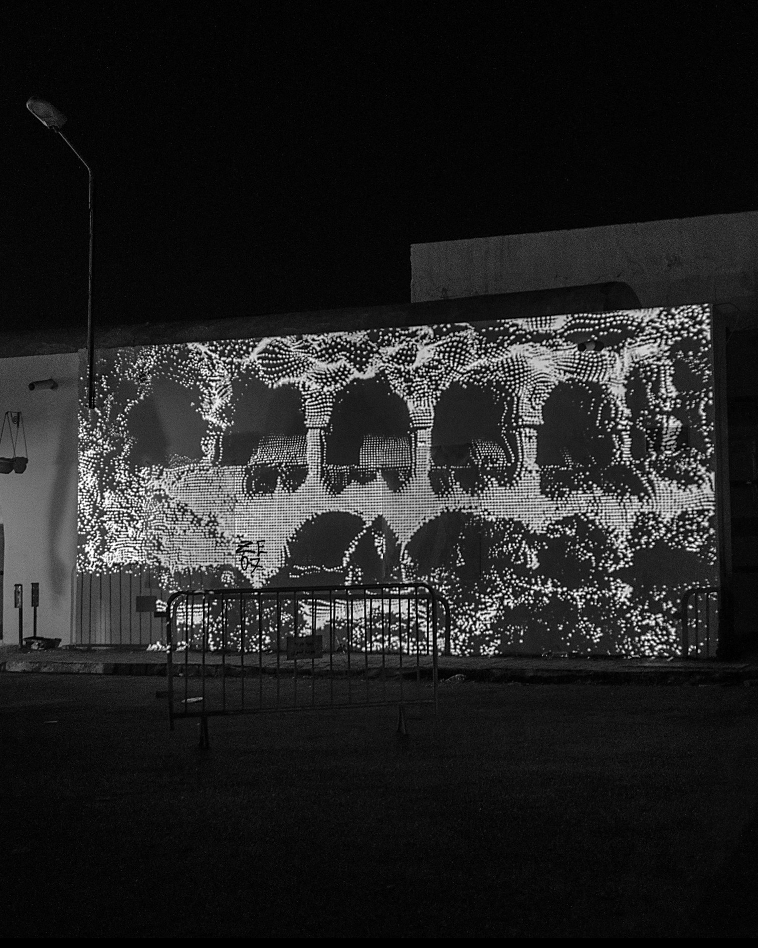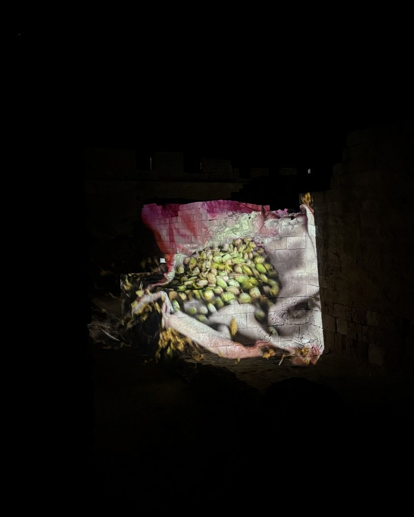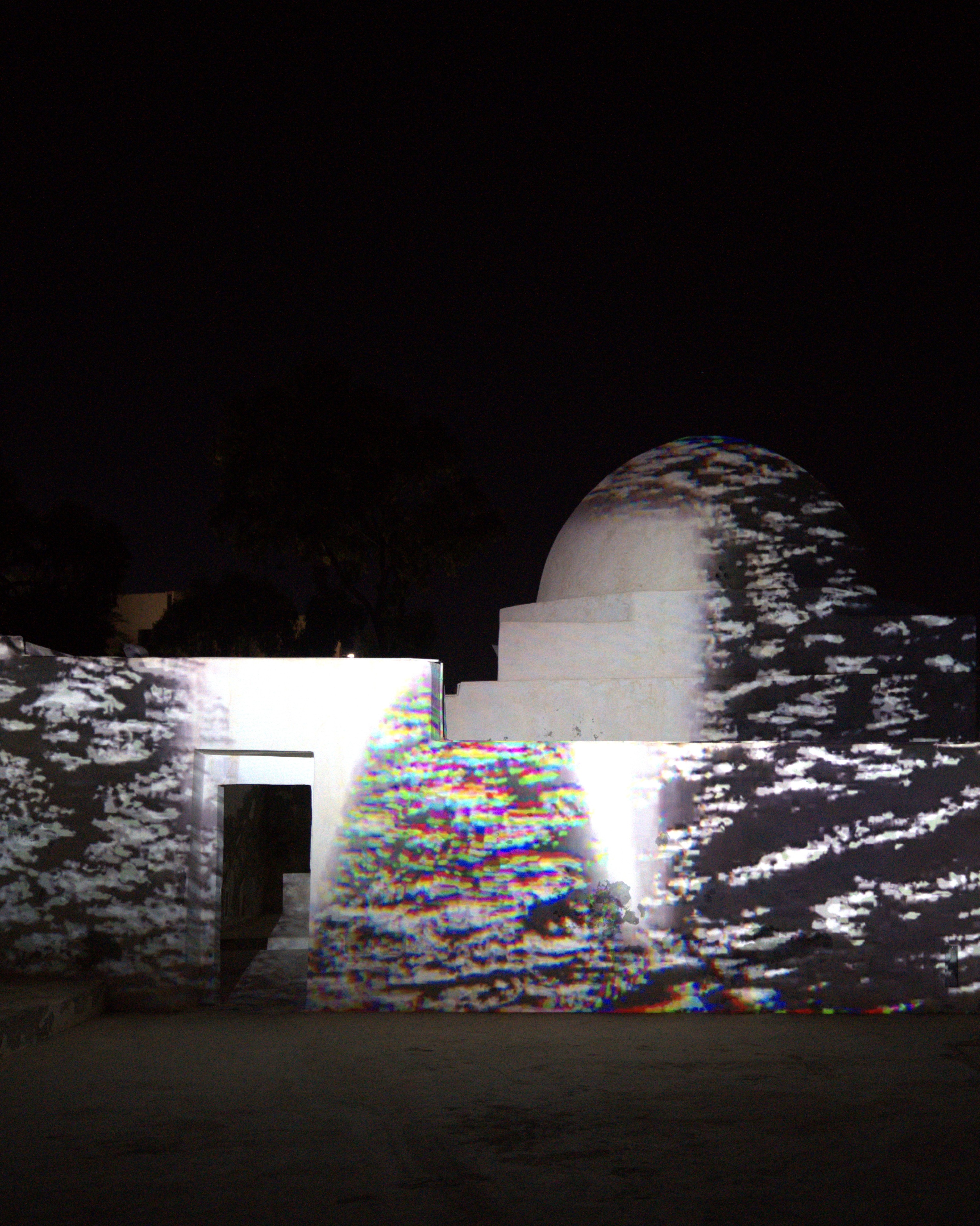Camilla Angolini and Ahmetcan GƶkƧeer embodied the principles of transdisciplinary cooperation by merging scientific observation, digital technology, and artistic experimentation into a single, immersive work. The “LITP” video projection extended across two inner courtyards of the museum. In dialogue with the exhibition context in Houmt Souk, the artwork incorporated the chromatics of the environment and spatial textures: The bleached white walls and weathered surfaces of the museum interwove with the projected images.