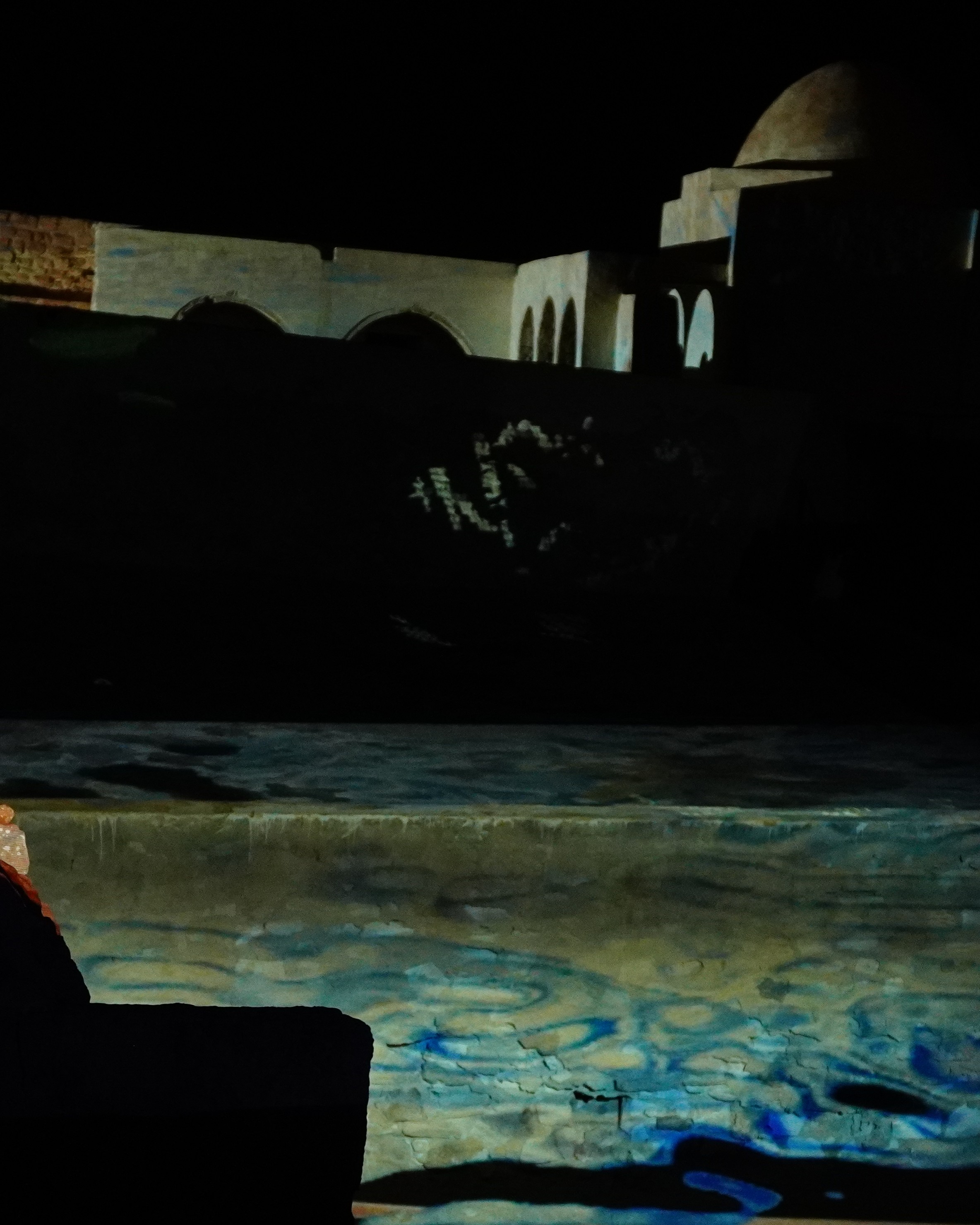Achref Guesmi’s artwork was set against the backdrop of the Borj El Kebir fortress. Built around 1392, the historic stronghold stood as a canvas colored by the sands of time, its greys, ochres, and roses mirroring the surrounding landscape. The projections and soundscapes were site-specifically adapted and formed immersive spaces, passages of darkness, and evocative soundscapes that invited reflection. From the interplay of the diaphane imageries against the fortressās weathered stones emerged an atmosphere of thoughtfulness dedicated to the vulnerability of the Amazigh culture, articulated in a new and unique artistic voice.